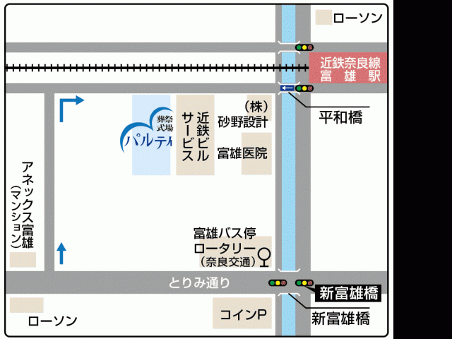 近鉄奈良線 富雄駅西口前 徒歩1分 最も駅に近い式場です。専用駐車場も26台 完備 。ご見学・ご相談は365日の受付。事前にご連絡下さい。1級葬祭ディレクター・全葬連葬儀事前相談員が安心・丁寧に対応いたします。